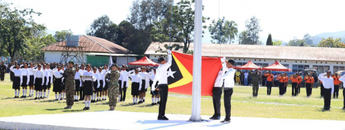 Administrador Tékniku Autoridade Nasional Komunikasaun (ANC.IP) Sr. Novelino dos Santos akompaña Ministru Transporte no Komunikasaun Eng. Minguel Marques Goncalves Manetelu hodi partisipa serimónia isar bandeira nasionál, iha komemorasaun loron proklamasaun independénsia unilaterál Repúblika Demokrátika Timor-Leste (RDTL) ba dala 50 ne'ebé ho tema “ 𝙌𝙪𝙚 𝙖 𝙘𝙚𝙡𝙚𝙗𝙧𝙖çã𝙤 𝙙𝙚𝙨𝙩𝙚 50 𝙖𝙣𝙤𝙨, 𝙙𝙤𝙨 𝙥𝙖𝙨𝙨𝙖𝙙𝙤, 𝙣𝙤𝙨 𝙖𝙨𝙨𝙚𝙜𝙪𝙧𝙚 𝙘𝙤𝙣𝙛𝙞𝙖𝙣ç𝙖 𝙣𝙤 𝙥𝙧𝙚𝙨𝙚𝙣𝙩𝙚 𝙚 𝙚𝙨𝙥𝙚𝙧𝙖𝙣ç𝙖 𝙣𝙤 𝙛𝙪𝙩𝙪𝙧𝙤”, iha Kampu Demokrátika Gleno Munisípiu Ermera.